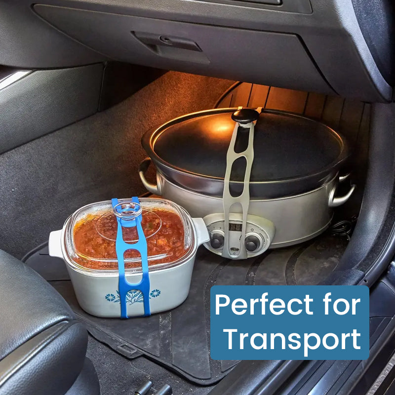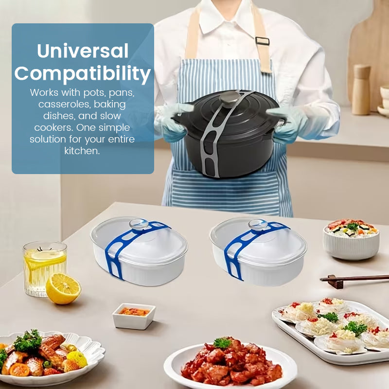 Med denna återanvändbara universella lockrem hålls locken säkert stängda och spill undviks. Den passar på grytor, kastruller, ugnsformar och långkokare och gör transporten av mat enkel, säker och ren.