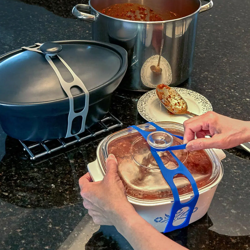 Den flexibla remmen kan sträckas ut till att passa en mängd olika kokkärl och håller locken säkert på plats under transport eller förvaring.