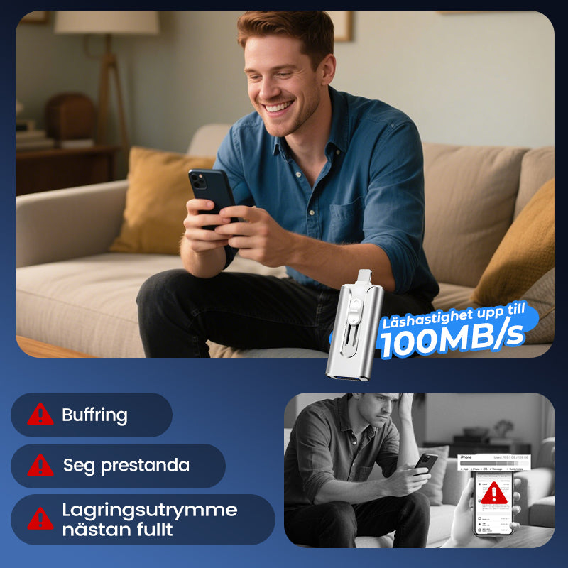 TRIPELKOMPATIBILITET: Fungerar sömlöst mellan iPhone (Lightning), Android (Micro USB via medföljande adapter) och datorer (USB 3.0). Överför filer mellan olika ekosystem utan kablar eller komplicerad programvara.